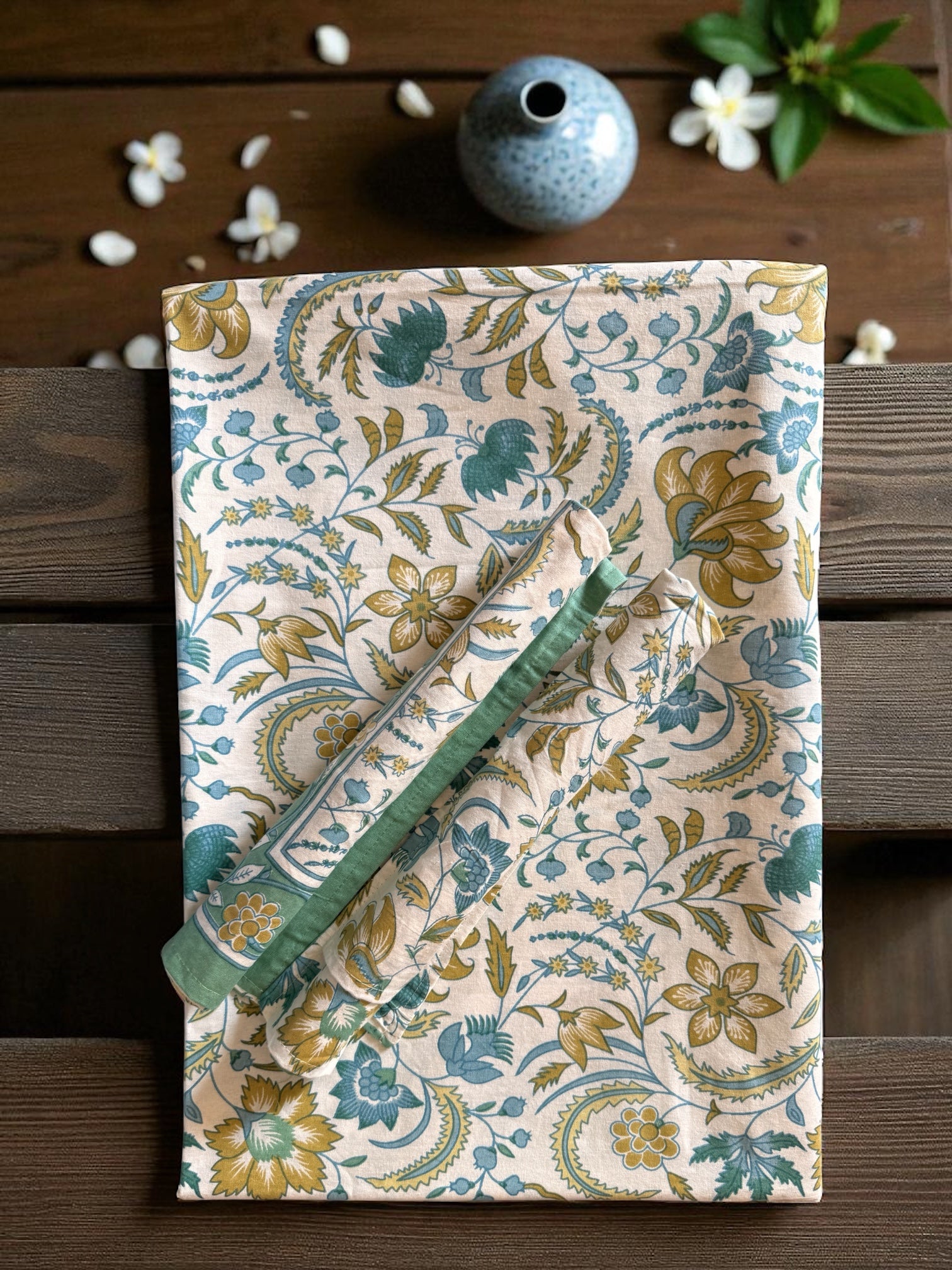 A garden of olive greens and soft teals dances across a soft ivory canvas. Bagh-e-Zaitoon draws from Mughal floral motifs and vintage Rajasthani frescoes, ideal for elegant, earthy bedrooms.