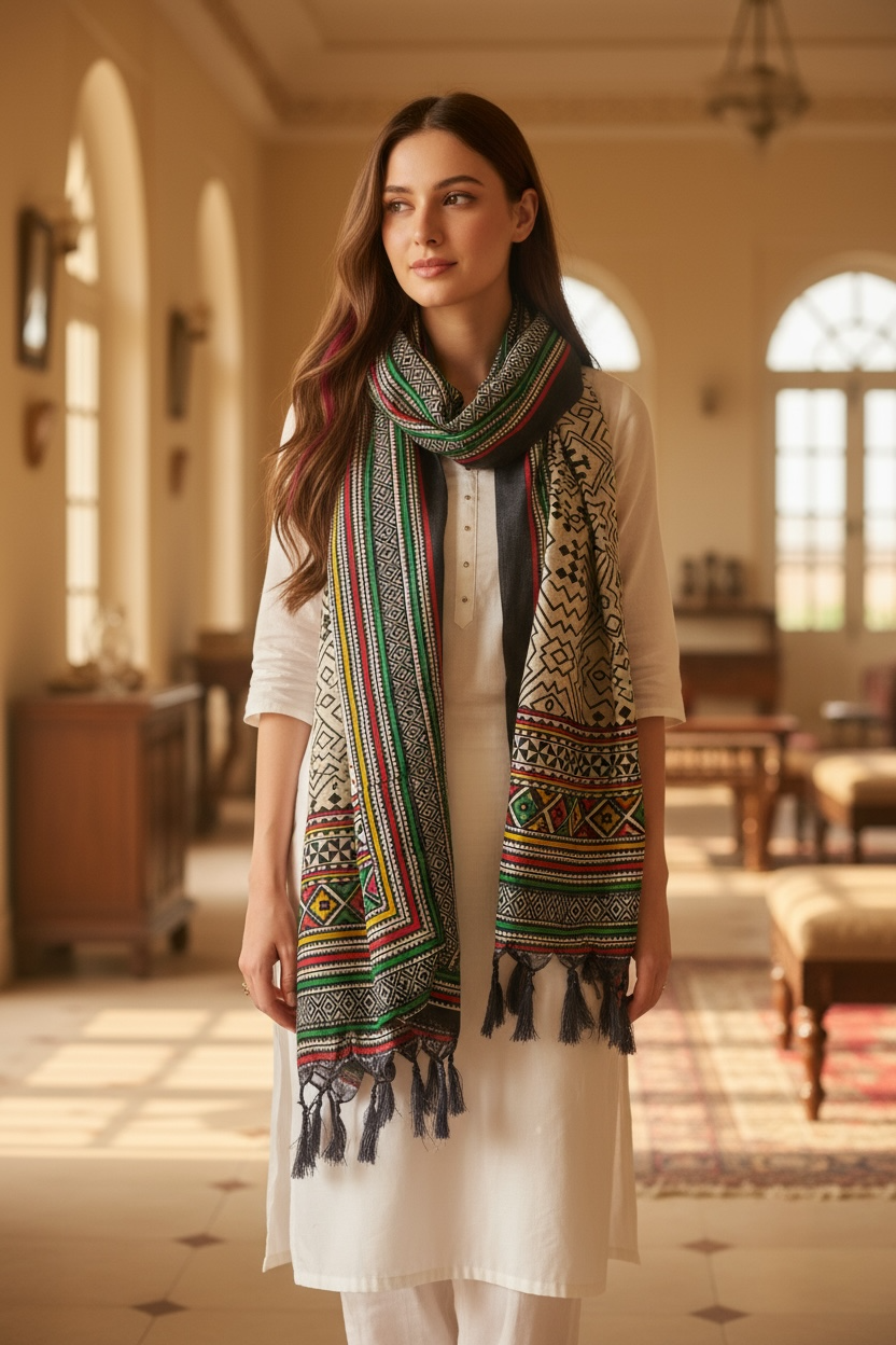 Tribal geometrics in soft beige, and lively pops of emerald, ruby and mustard run across this dupatta with a satiny fall that feels contemporary yet rooted.
