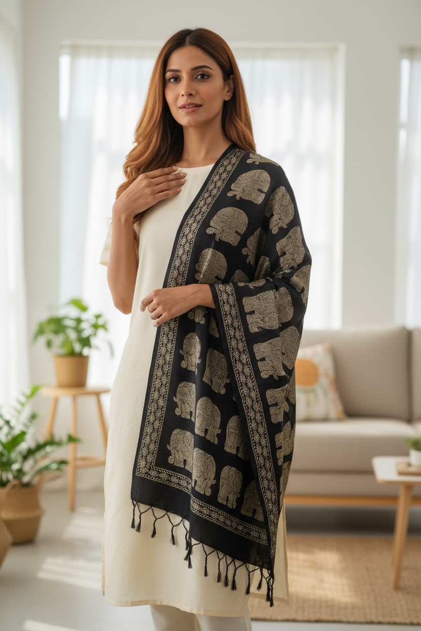 In midnight black, this dupatta bears antique-gold gajraj bootis and a stately temple border with the surface glowing softly as it falls with courtly ease and elegance.