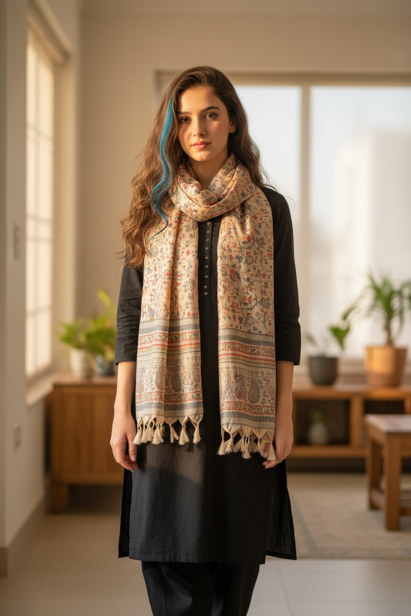 Whisper-soft florals bloom over a sand-beige base with delicate paisley borders in blush, sage and muted rust. This dupatta's glow makes every movement look serene and polished.