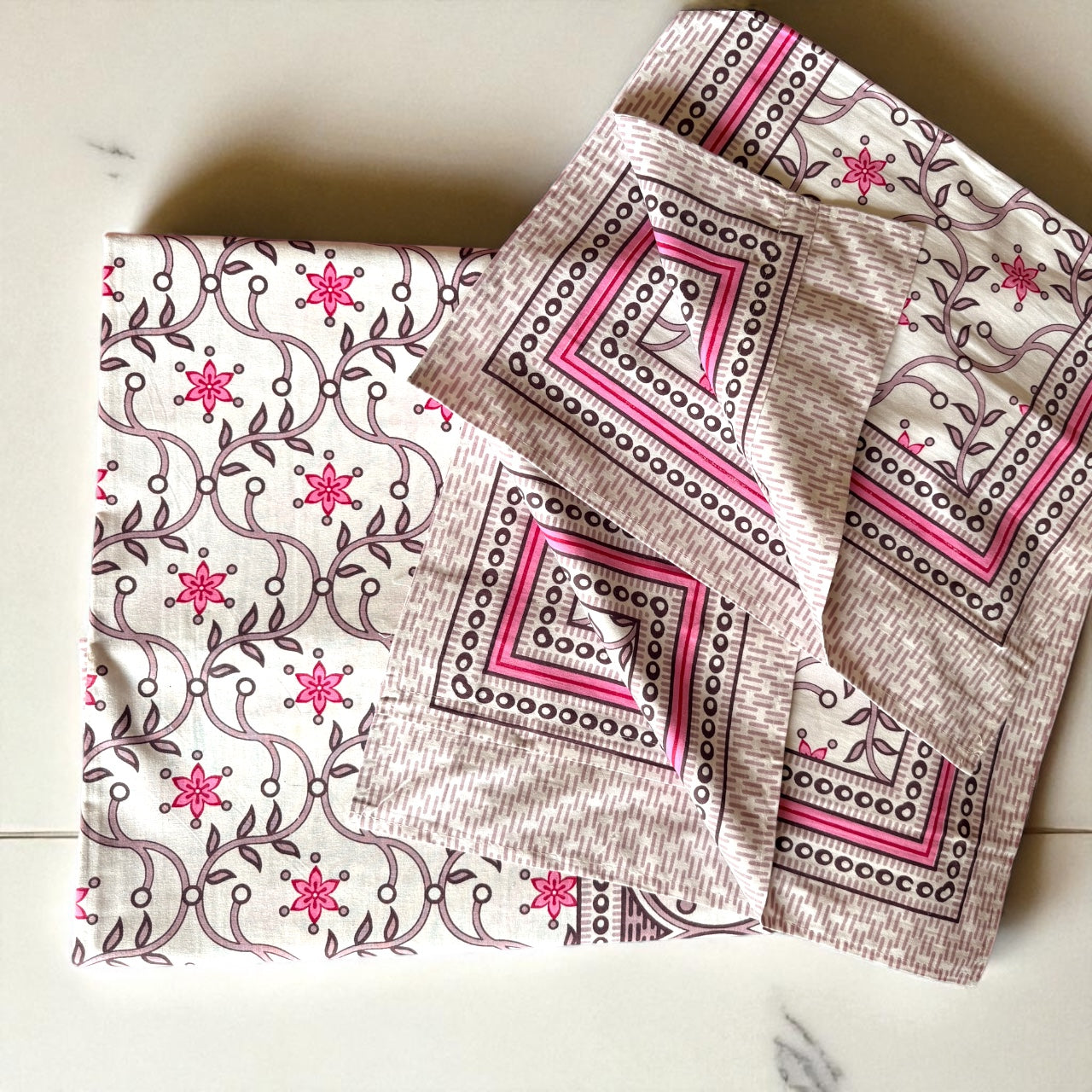 Vine motifs and mehraab-style geometry, laid out on an ivory background. Crafted on soft cotton by local Rajasthani artisans, the Gulaabi Mehraab bedsheet adds a gentle romance to your bedroom look.