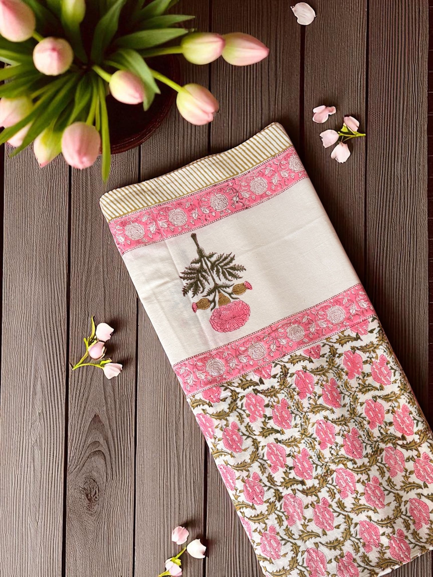 Gulaabi Mehfil brings together an ivory ground with rose-pink bootis, leafy vines, and a delicately printed border. Inspired by Jaipur’s spring courtyards where brass thalis, family time, and easy conversations came together around the table.