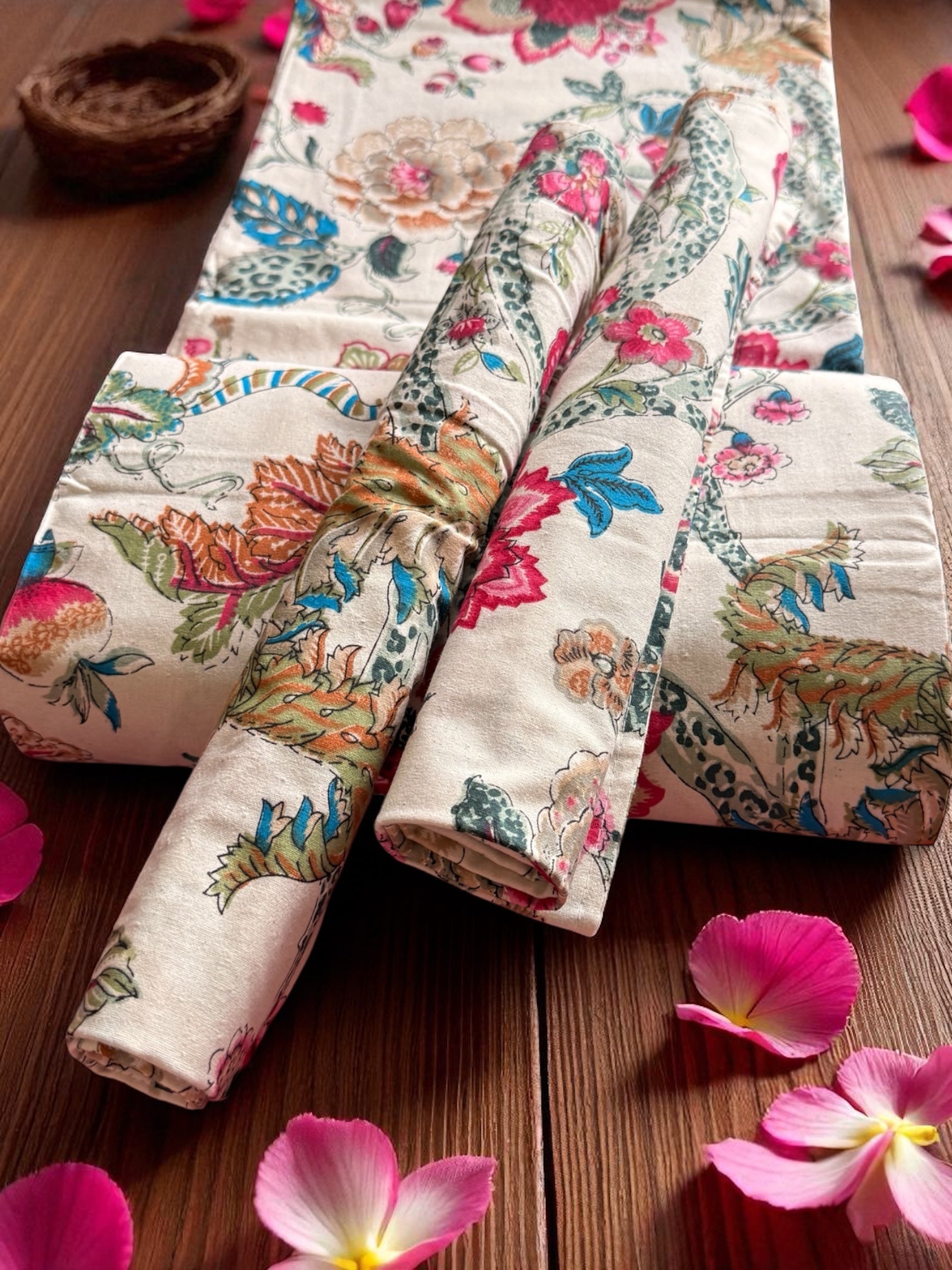 An ode to Shekhawati garden murals, the Mughal Bagh bedsheet is artisan-printed on pure cotton to lift the room and settle-in like it’s always belonged.