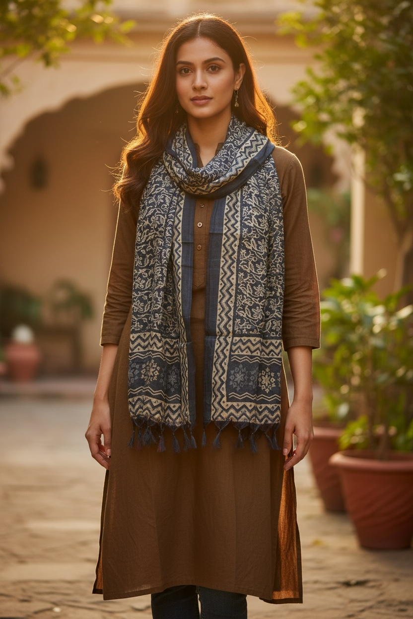 Inky blue bands frame vine tracery and chevrons in soft ivory, crafting a poised look that defined cool and breathable. This dupatta's look is refined and timeless.