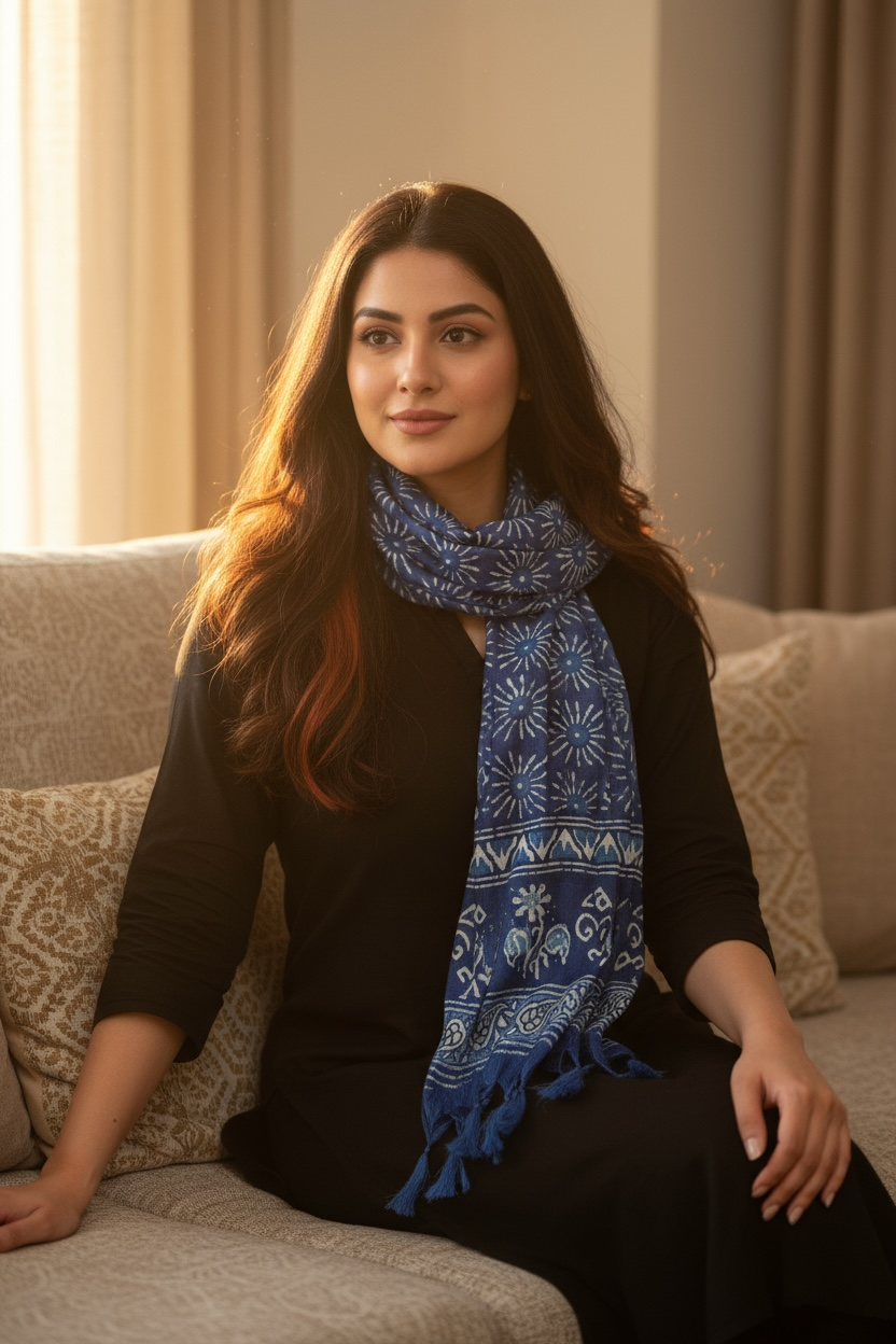 Deep blue blooms with sunburst butis in white and heritage borders that glow with a soft sheen, falling in a fluid, feather-light drape that feels effortlessly regal.