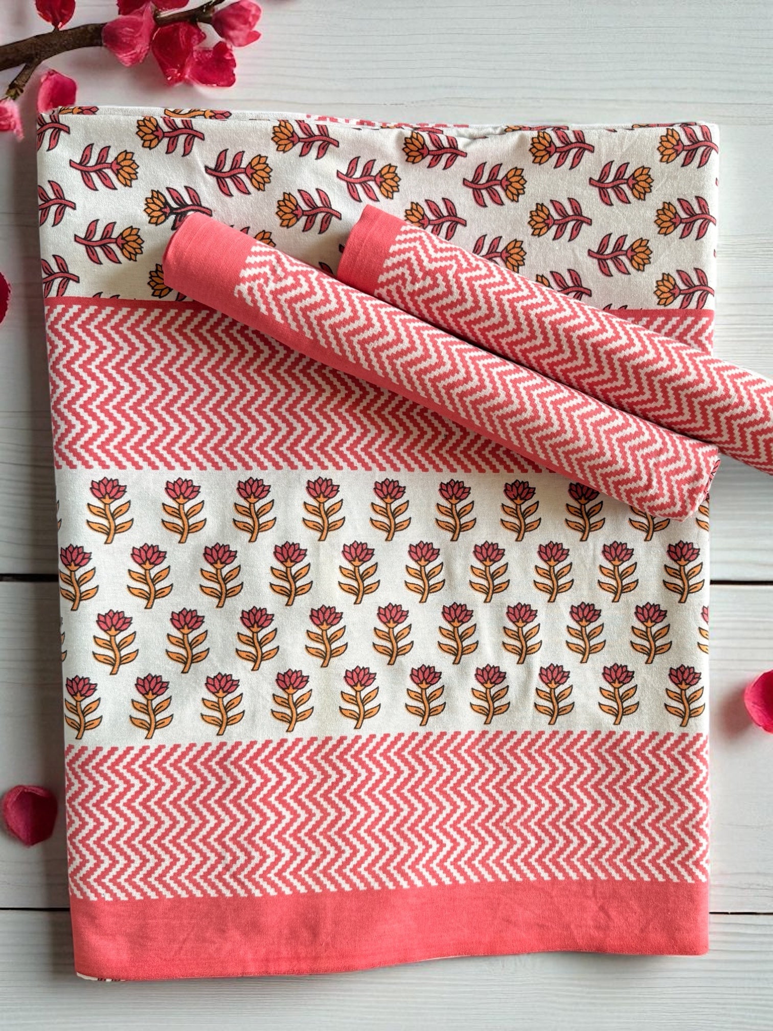 A playful burst of reds and oranges hand-printed with rhythmic chevrons, this design evokes the charm of springtime fields in full bloom. Phoolkari Gulbahar is made for homes that love colour and character.