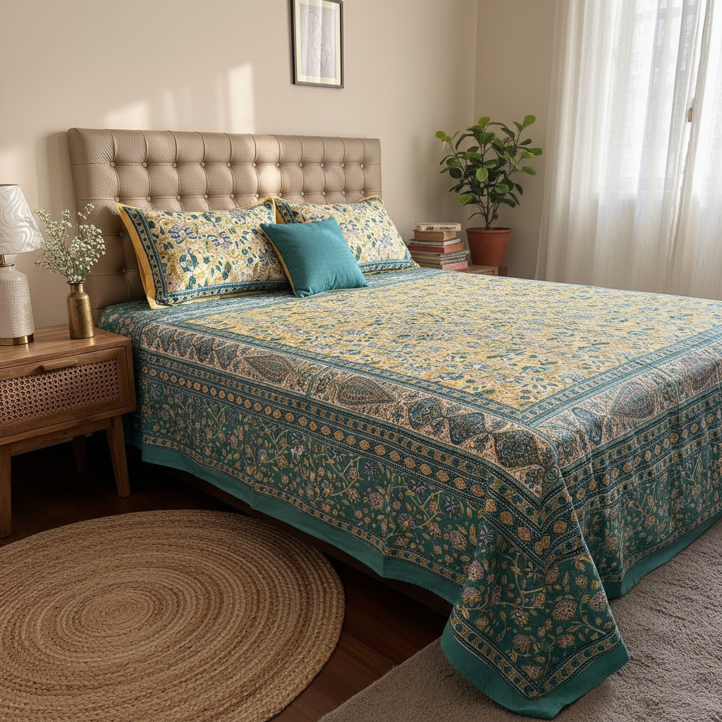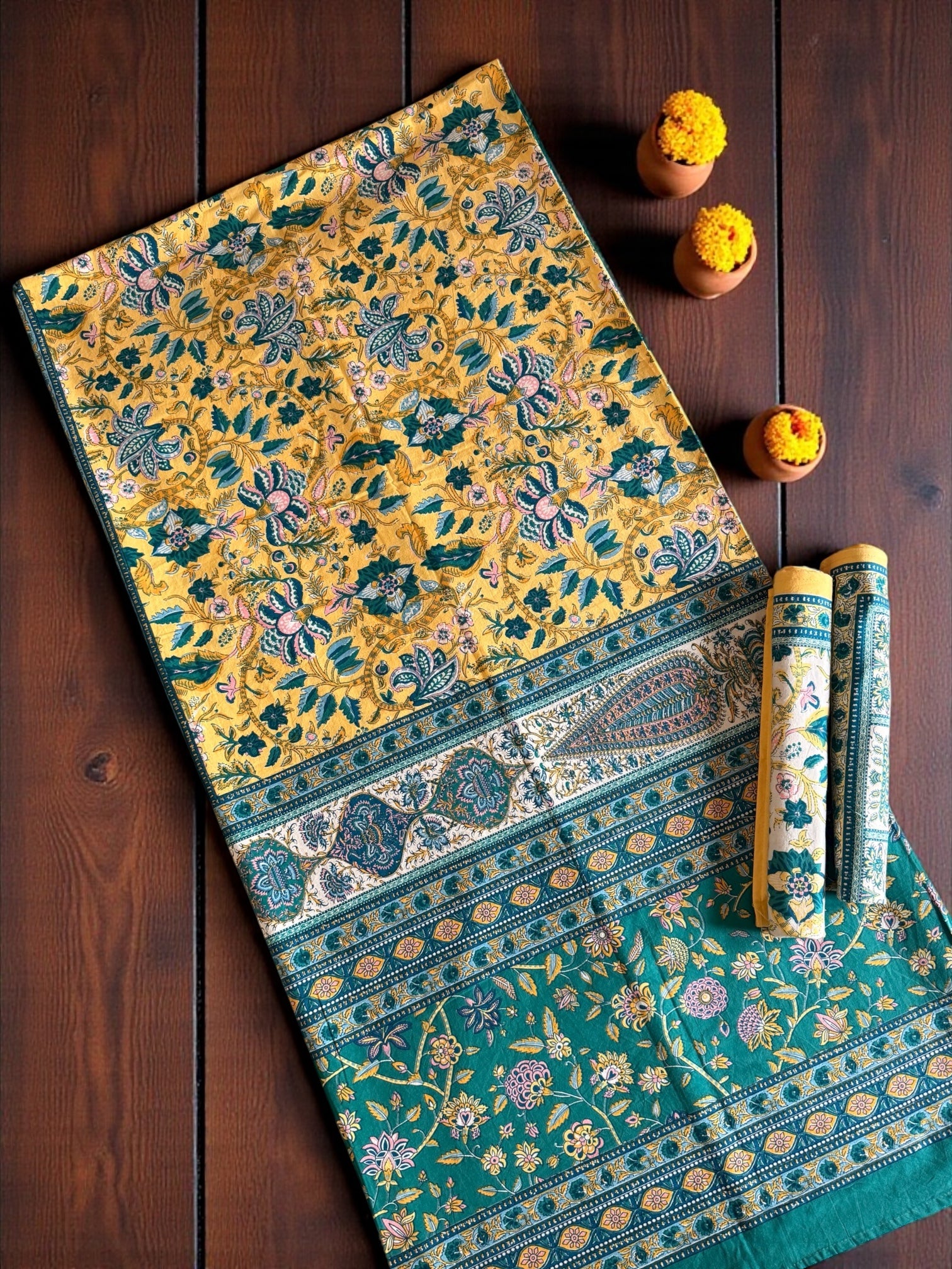 Sunlit marigold blooms rest within deep teal vines and paisley panels, finished with a regal teal edging. Meticulously handcrafted on soft cotton, Sunehri Bagh glows like a festive durbar that’s opulent yet welcoming.