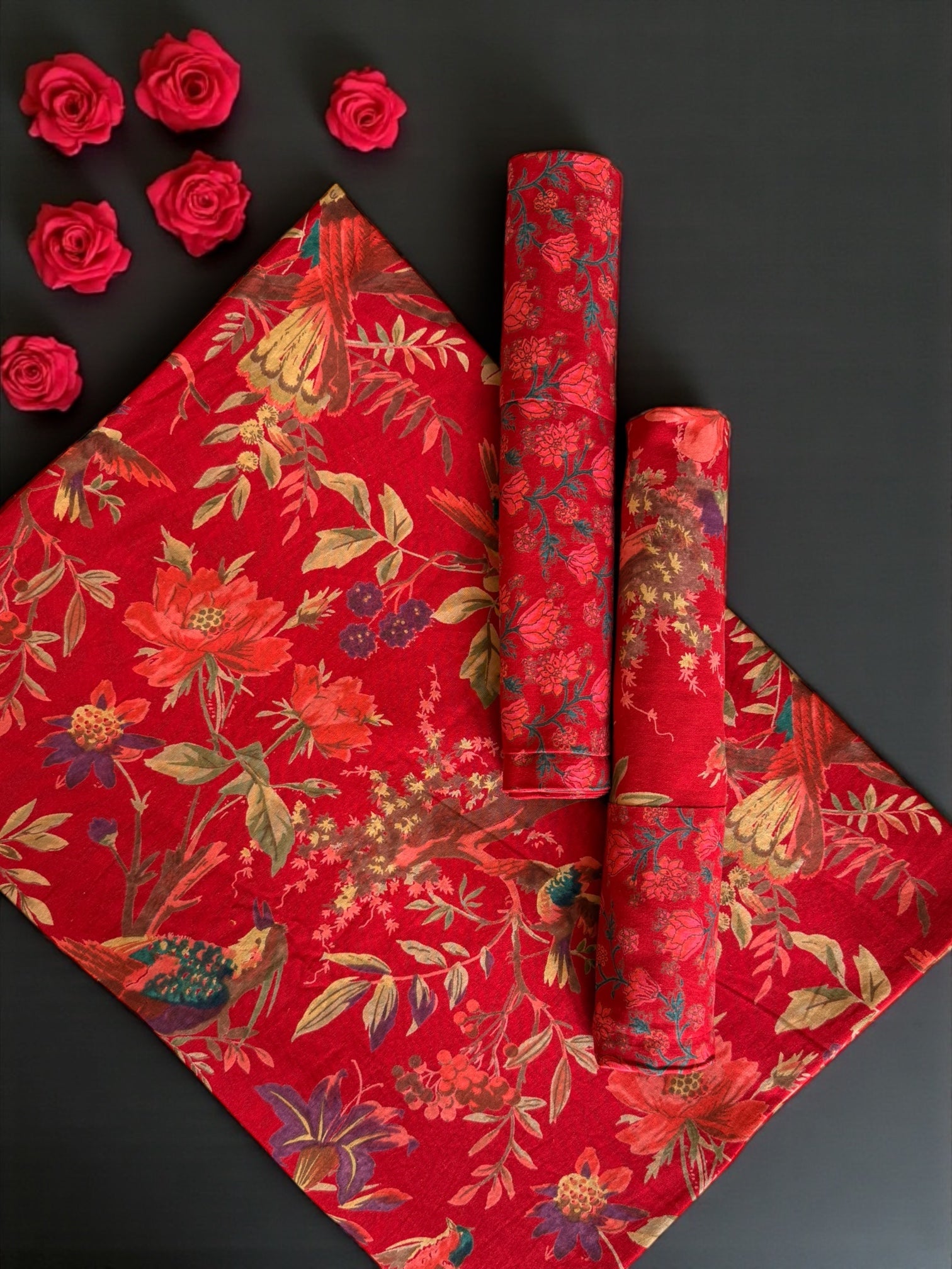 A luminous vermilion garden of painterly blooms and songbirds on rich red backdrop. Artisan-printed in Rajasthan, Surkh Gulistan lends festive warmth and quiet opulence - elegant with ivory layers and antique-gold accents.