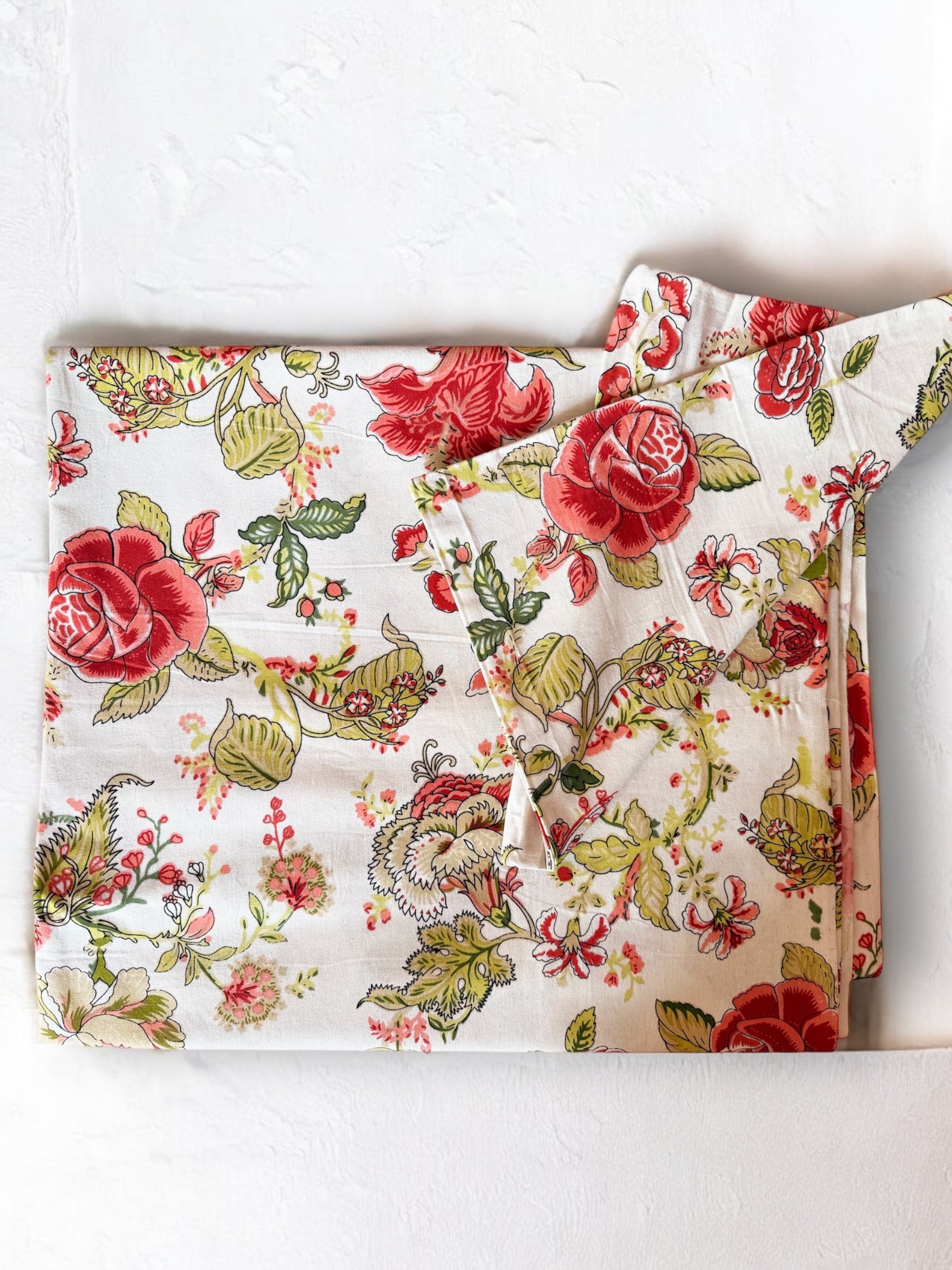Inspired by the vibrant gardens of Rajasthan, this exquisite bedsheet features lush red blooms intertwined with delicate green leaves and soft, playful accents. The intricate floral motifs celebrate the region’s rich artistic tradition radiating joy and heritage-inspired grace.