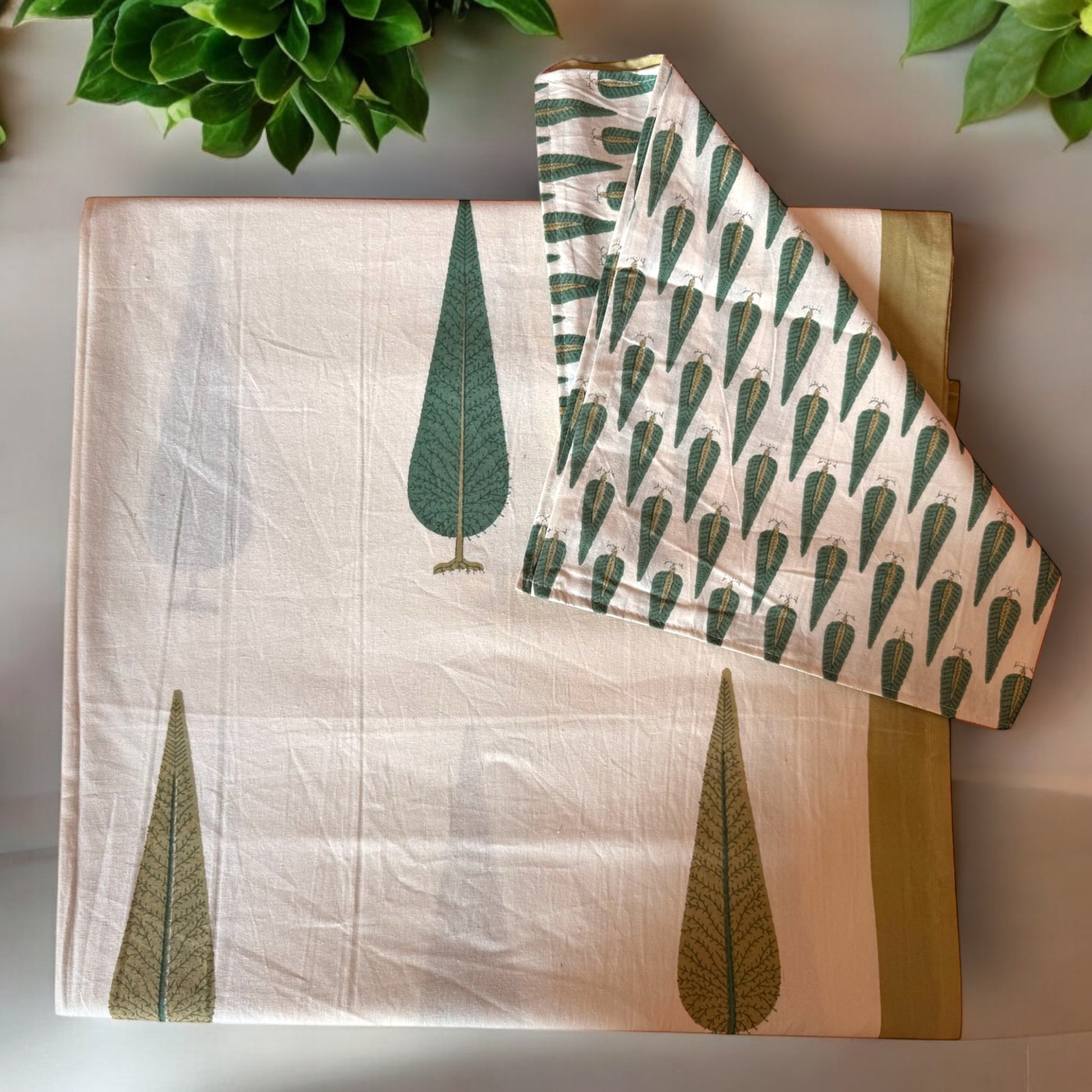 Inspired by the timeless beauty of Rajasthan’s landscapes, this bedsheet features elegant cypress tree motifs that symbolize grace and tranquillity. The harmonious green tones, delicately hand-printed, bring the serenity of nature indoors, offering a calming and grounded aesthetic.