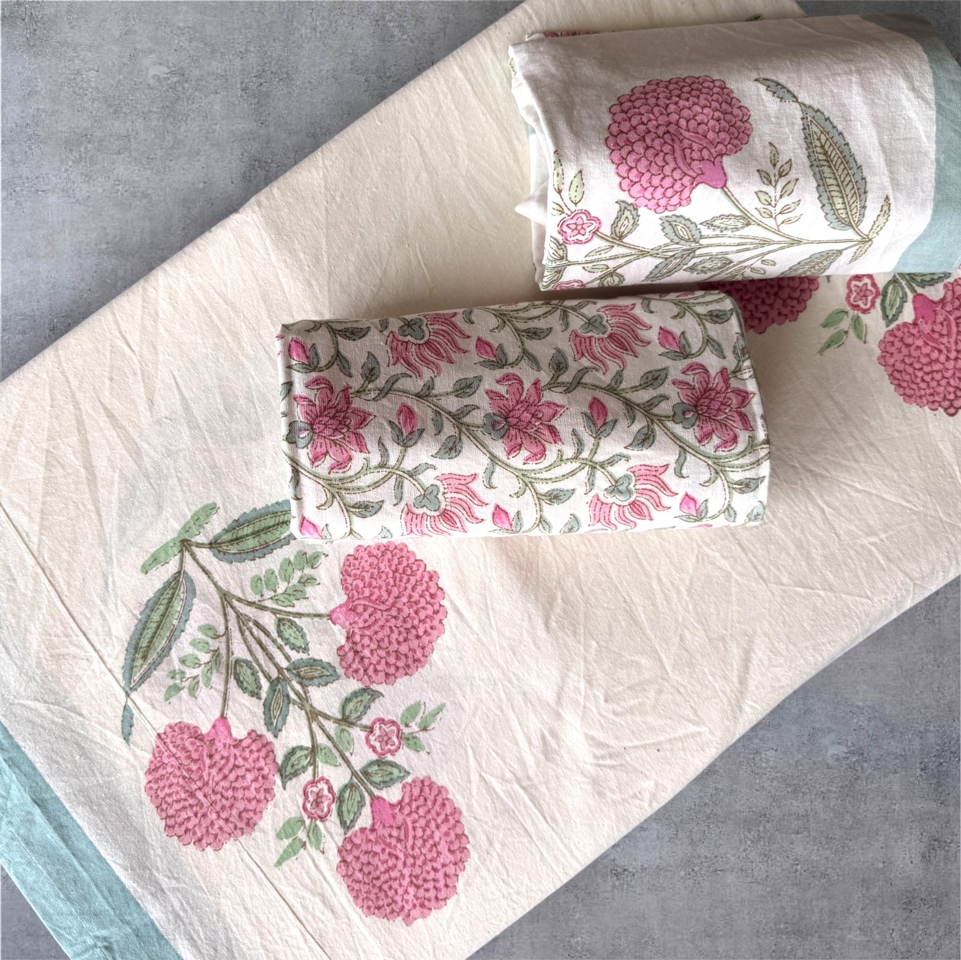 Soft ivory cotton adorned with delicate block motifs in blush pink and muted green. Its design is timeless yet subtle, weaving refinement into every thread. Crafted by skilled artisans of Rajasthan, it brings quiet sophistication and everyday comfort to your home.