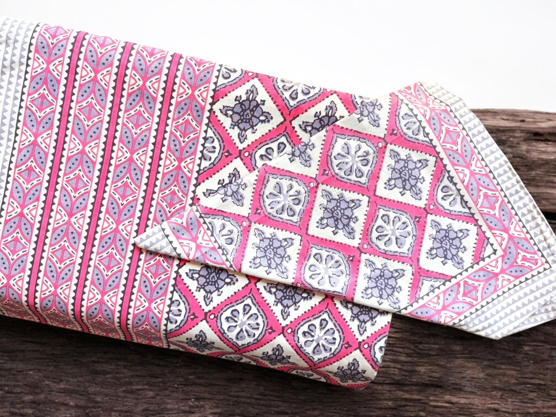This bedsheet comes with a vibrant play of fuchsia and lilac in intricate tile-inspired patterns. This design is a tribute to the ornate floors and walls of Rajasthan’s royal palaces, bringing heritage geometry to life in your bedroom.