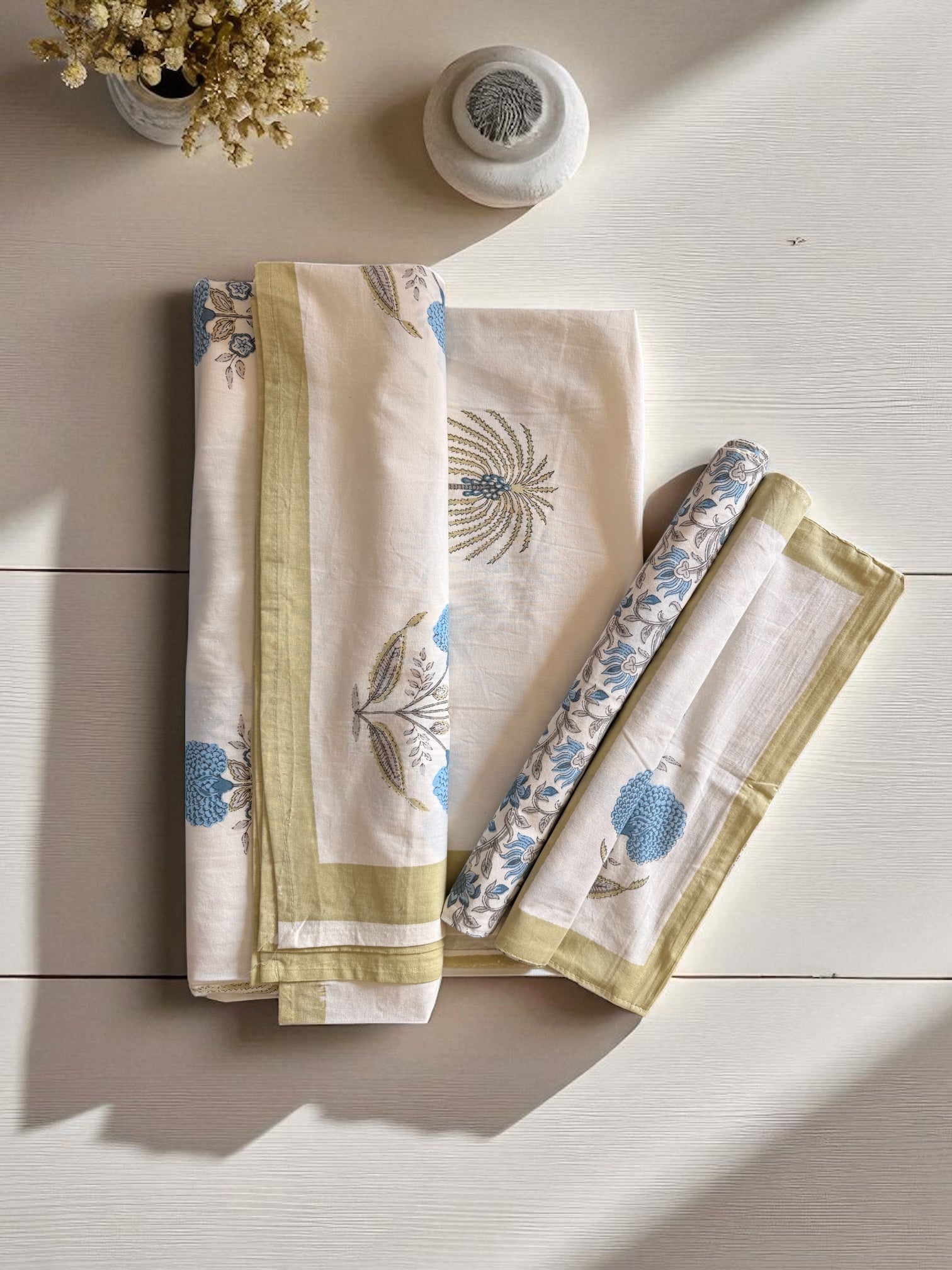 Soft ivory canvas adorned with delicate blue florals that feel like whispers of spring. This sheet evokes serenity, blending timeless Rajasthani artistry with calming hues for a restful retreat.