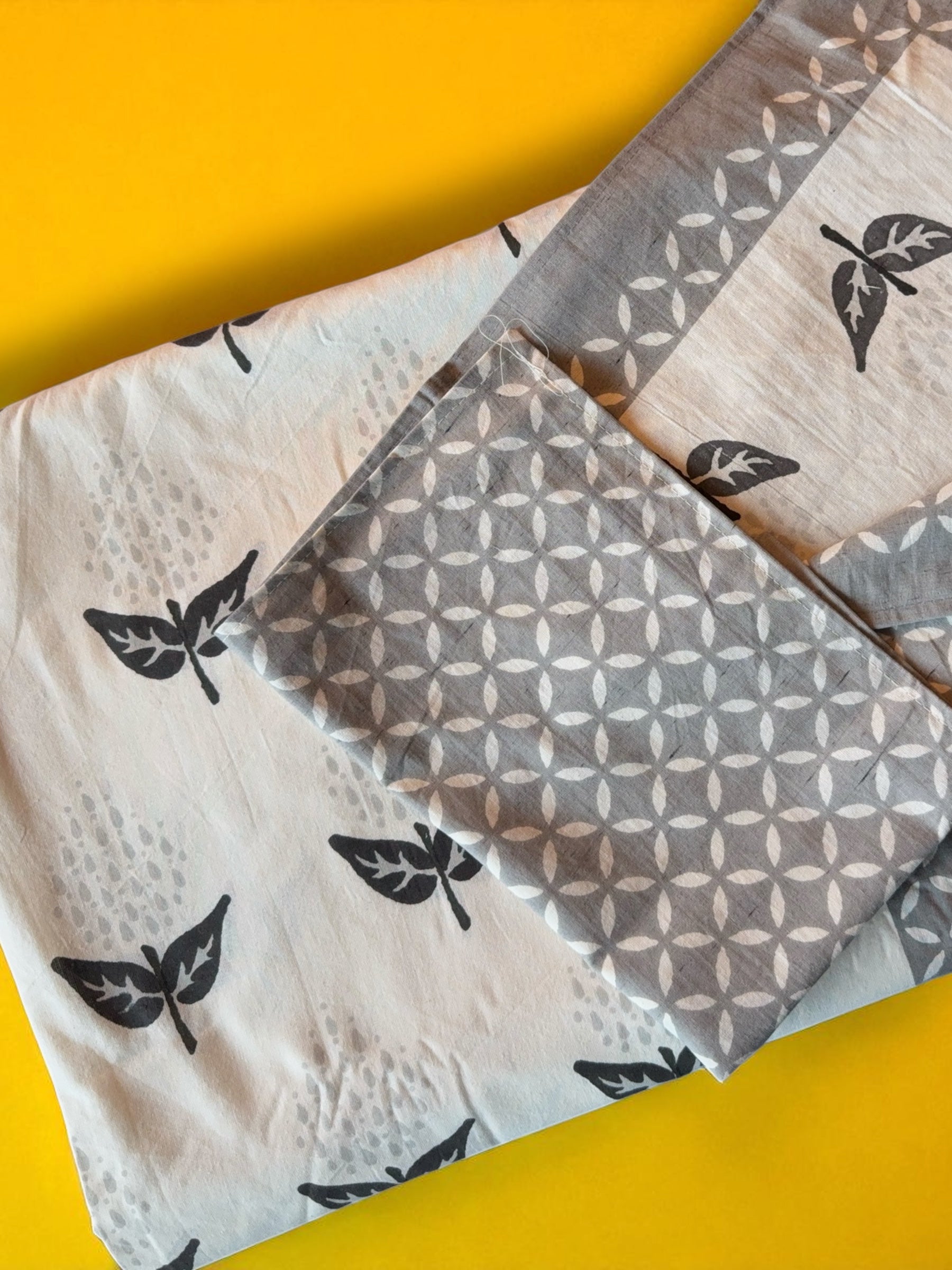 This design captures the poetry of nature in soft grey cotton. Leaf motifs echo the gardens of Amer and Udaipur, where tradition meets tranquility. Paired with a geometric border reminiscent of ancient jaali patterns, this piece is a slice of heritage for your everyday comfort.